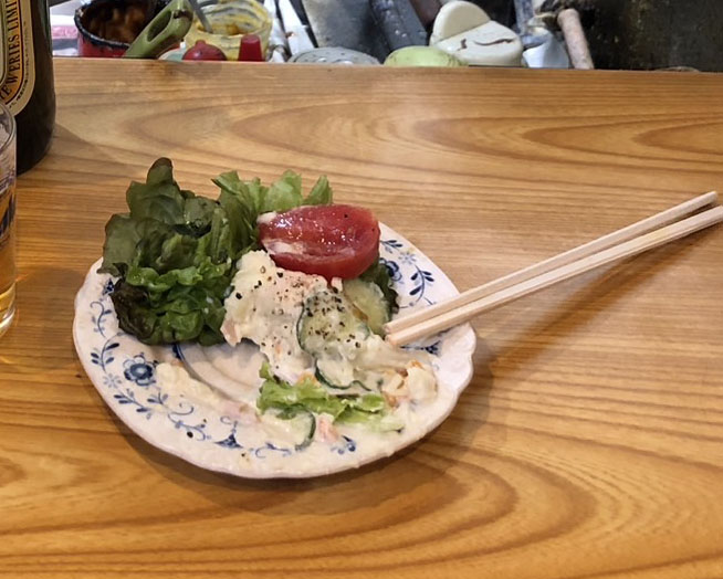 赤星に合わせるのは、迷うまでもなく“ますやのポテサラ”。手作り感たっぷりで、マヨの塩梅も絶妙。