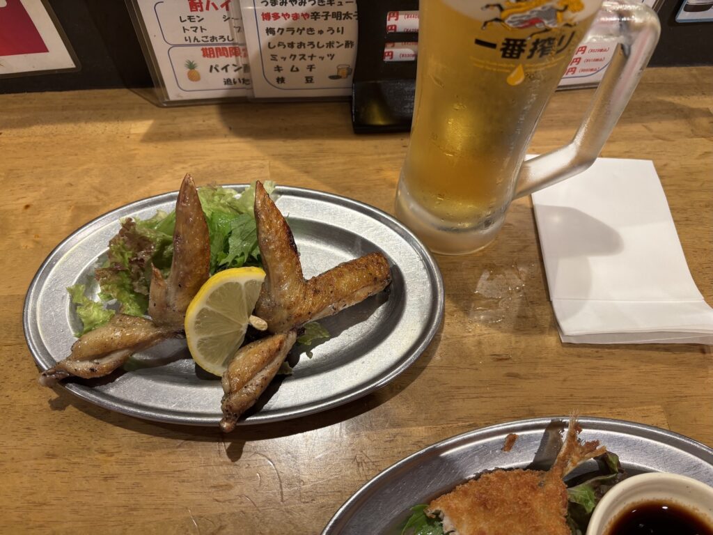 安定の生ビール190円。アジフライ、塩手羽焼き──鉄板メニューを注文。