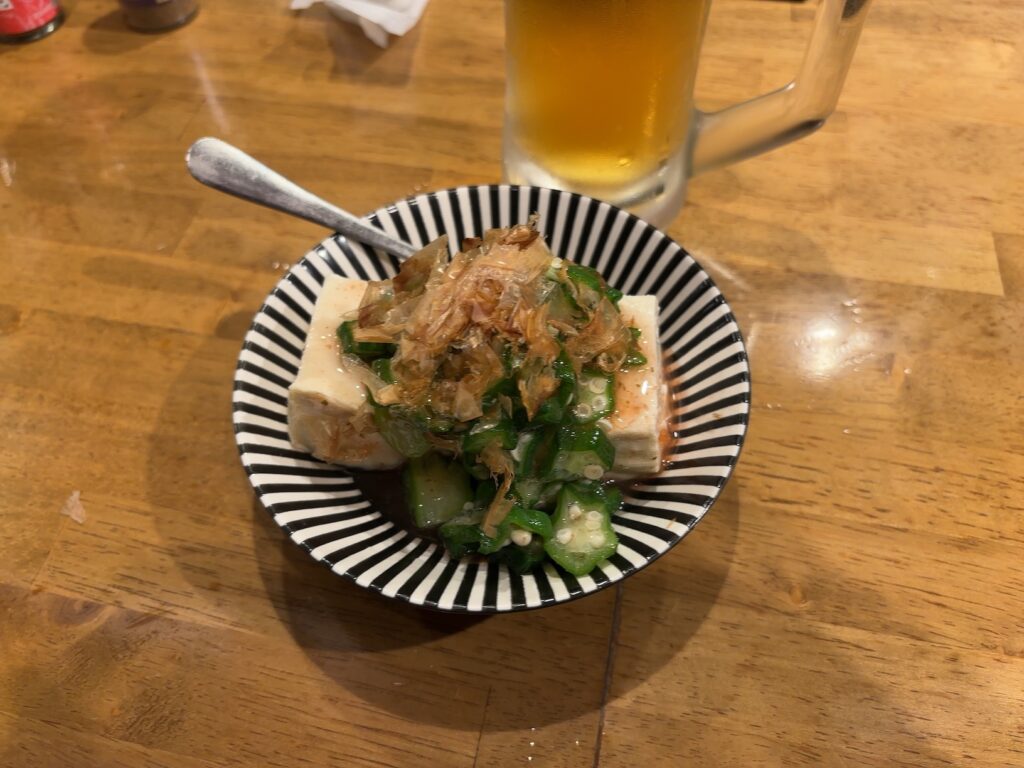 まず届いたんは梅おくら冷奴。見た目は地味やが、これがなかなかどうして。