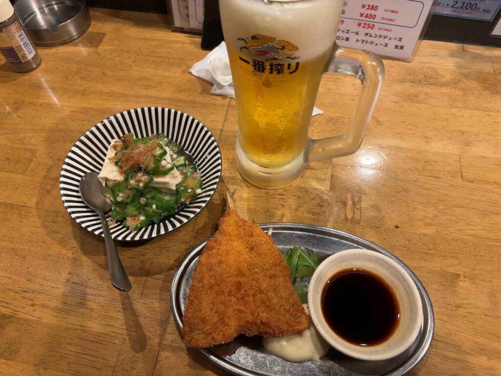 「兄さん、アジフライと梅おくらの冷奴、あとビールおかわり頼む!」