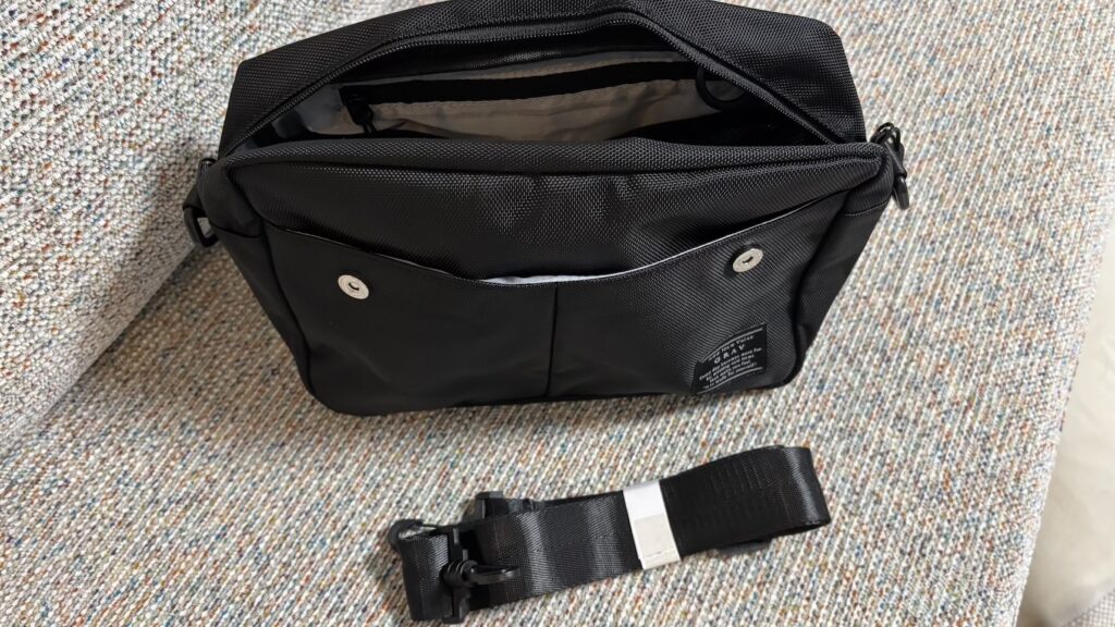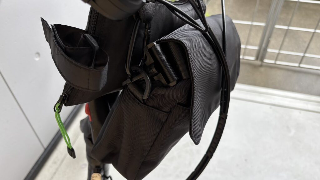 ポケットもええ感じに分かれてて、ごちゃつかない。肩掛けベルトもパチっと外れて軽快、輪行時にゃありがたいねぇ。