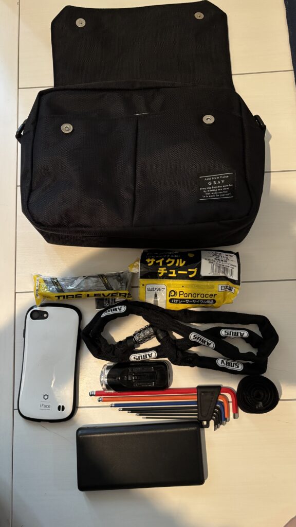 中を覗いて驚いたねぇ。スマホ、ワイヤーロック、パンク修理キット、モバイルバッテリー──全部入る。