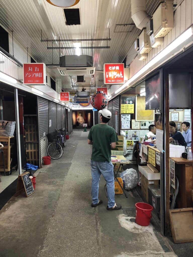 丸五市場の奥、まだ現役バリバリの**そば焼「いりちゃん」**に突入。