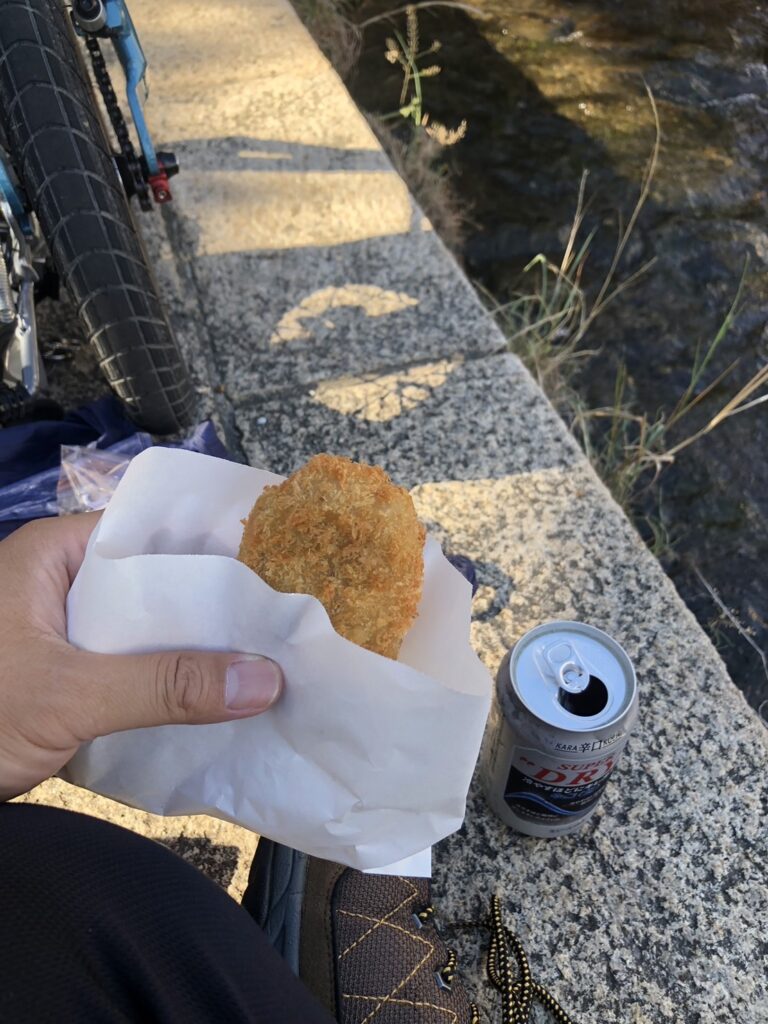 ビール&コロッケを川のせせらぎで流し込み、
