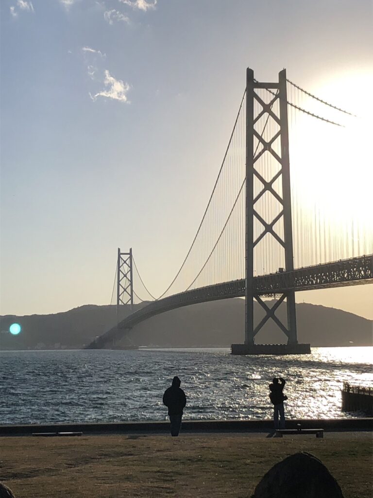 夕方、不思議な光景に出くわす。黄昏時、影のマジックか、明石海峡大橋が海に突っ込んどるように見える。淡路島側が妙に曲がって見えるその姿に、一同しばし無言。酒がなくても、景色が一杯分の価値を持つ瞬間や。
