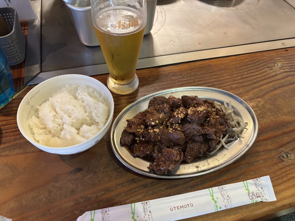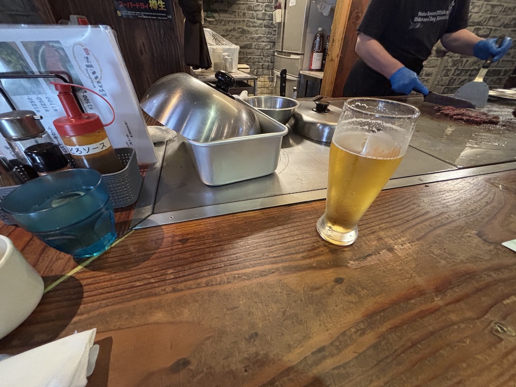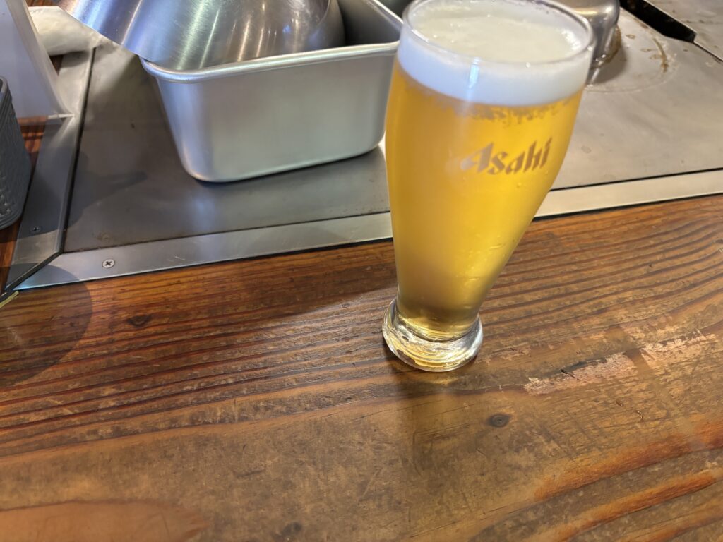 カウンター前の鉄板に陣取る。まずは「生ビール(550円)」をオーダー。