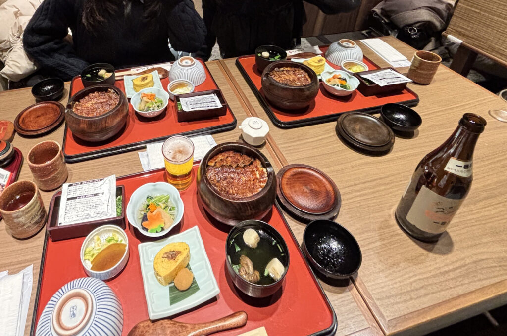 上ひつまぶしを3人前、当然ビールも注文。まずはそのまま、次は薬味、最後は出汁茶漬け。待った時間ごと報われる旨さに、若い衆も無言で箸を進め、最後は腹パンパンで大満足や。