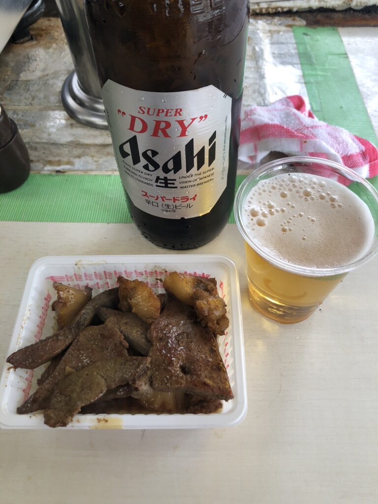 ホルモンとレバーを注文し、瓶ビールで流し込む。シンプルながらしっかりとした味付けで、夜勤明けの身体にじんわり染み渡る一皿。ニンニクを添えれば、さらに食欲を引き立てる。ここで一気にスイッチが入る、そんな感覚を味わえるお店だった。