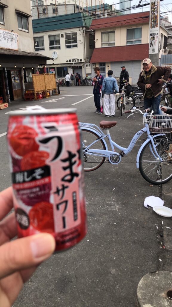 店を出たあとは、梅しそうまサワーを片手に西成の街を散策。昼間の西成は人通りも多く、独特の活気が漂っている。