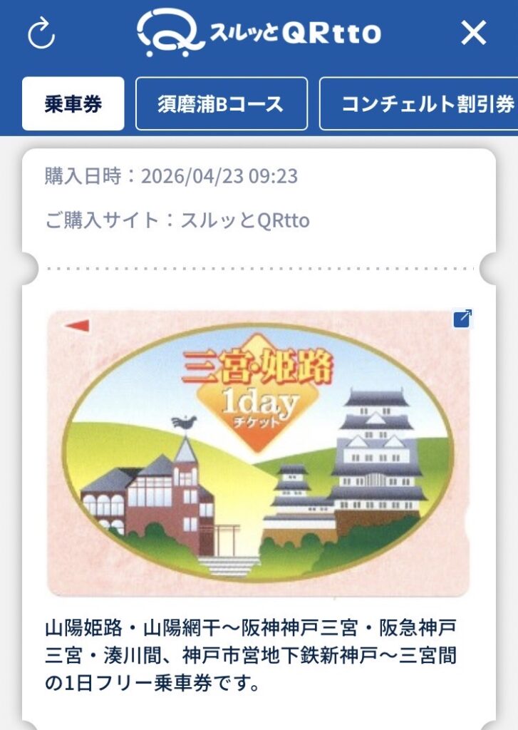 そこで登場したのがスルッとQRtto「三宮・姫路1dayチケット」(1,590円)。山陽姫路・山陽網干〜阪神神戸三宮・阪急神戸三宮・湊川間、神戸市営地下鉄新神戸〜三宮間が一日乗り放題になるお得なフリーパスだ。