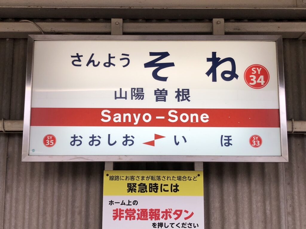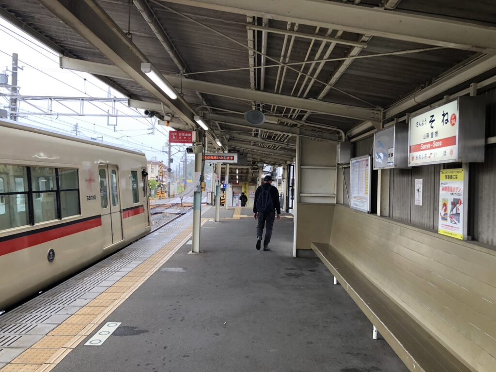 曽根駅を降り、雨の中を傘をさして歩く。駅名標「さんようそね」の文字が雨にけぶり、なかなかの昭和情緒だ。
