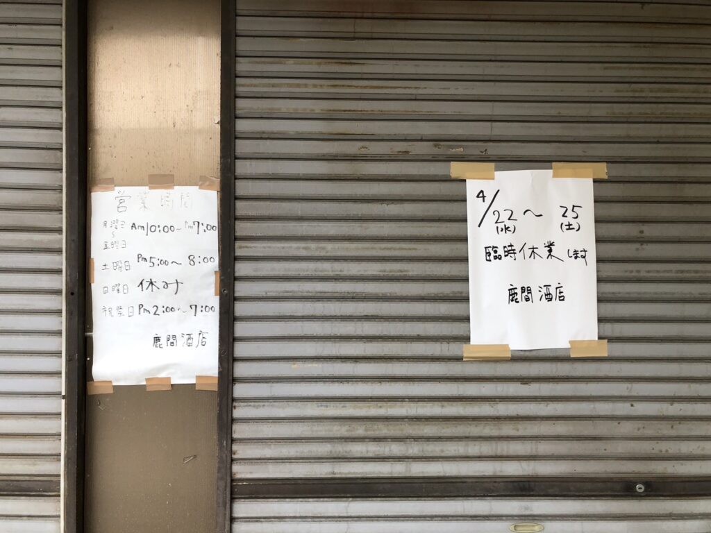 張り紙を見ると「4/22〜25 臨時休業 鹿間酒店」の文字。なんという間の悪さだ。