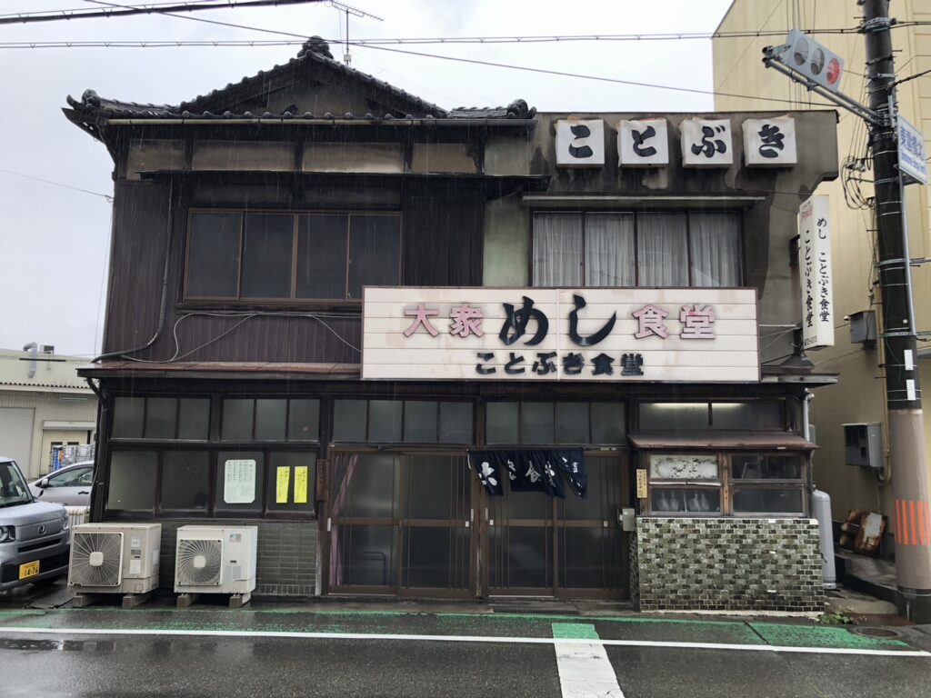 鹿間酒店のリベンジは次の機会に委ねることにして、次の目的地へ向かう。すぐさま網干へ移動し、前々から気になっていた**大衆めし食堂「ことぶき食堂」**だ。