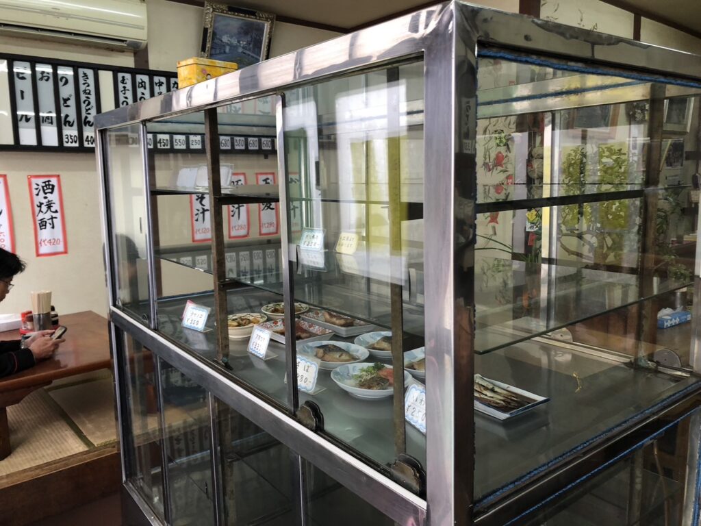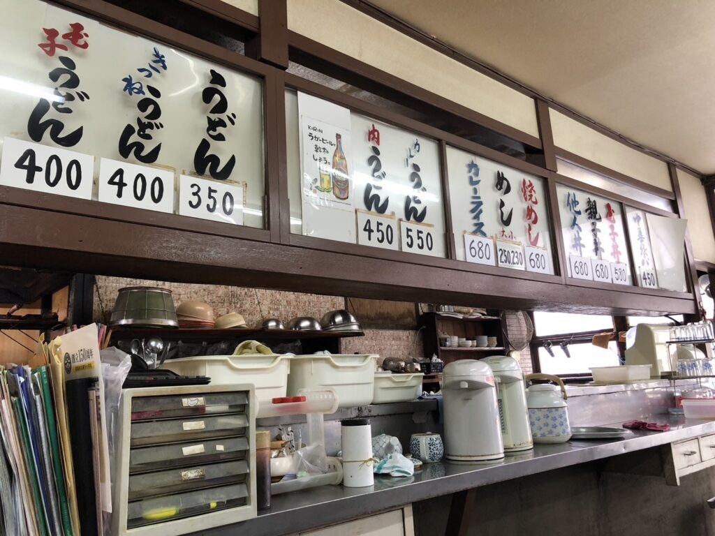 中に入ると、カウンターに並んだ手書きのメニュー、ガラスケースに並んだおでんの具材、厨房の雰囲気……全部が「そのまんま昭和」だ。うどん400円、焼めし680円、親子丼680円——この値段設定もまた頼もしい。
