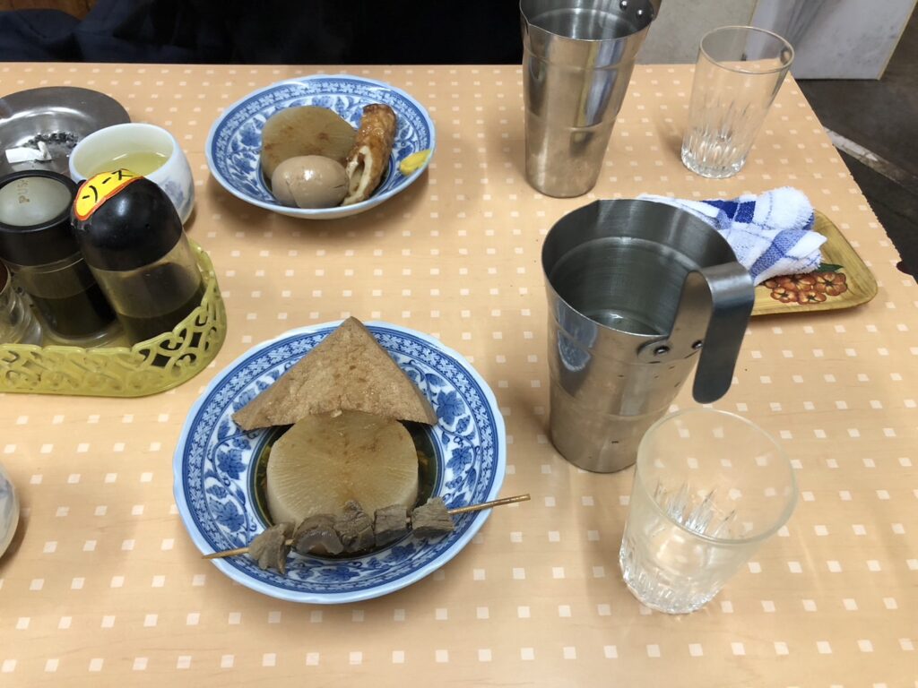 姫路おでんといえば、しょうが醤油で食べるのが地元流だ。よしべえさんは大根、卵、ちくわをチョイス。梅ちゃんは、大根、厚揚げ、すじをチョイス。4月とはいえ雨降りで少し肌寒い今日、店内にはストーブまで焚かれており、やかんが静かに湯気を上げている。その光景が、また味わい深い。