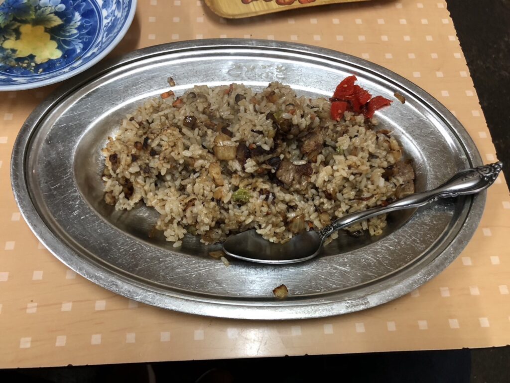 大根はしっかり味が染みていて、しょうが醤油との相性も申し分なし。加えて焼き飯も注文。銀のオーバルプレートに盛られた炒飯は、具材がしっかり混ざり込んで旨味が凝縮されている。皿の縁に刻まれた「ことぶき」の文字が、なんともいえない誇りを感じさせる。