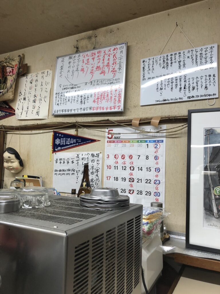 店内は昭和の味わいがそこかしこに漂う空間だ。壁には手書きの貼り紙などが残り、カレンダーだけが現代を知らせている。