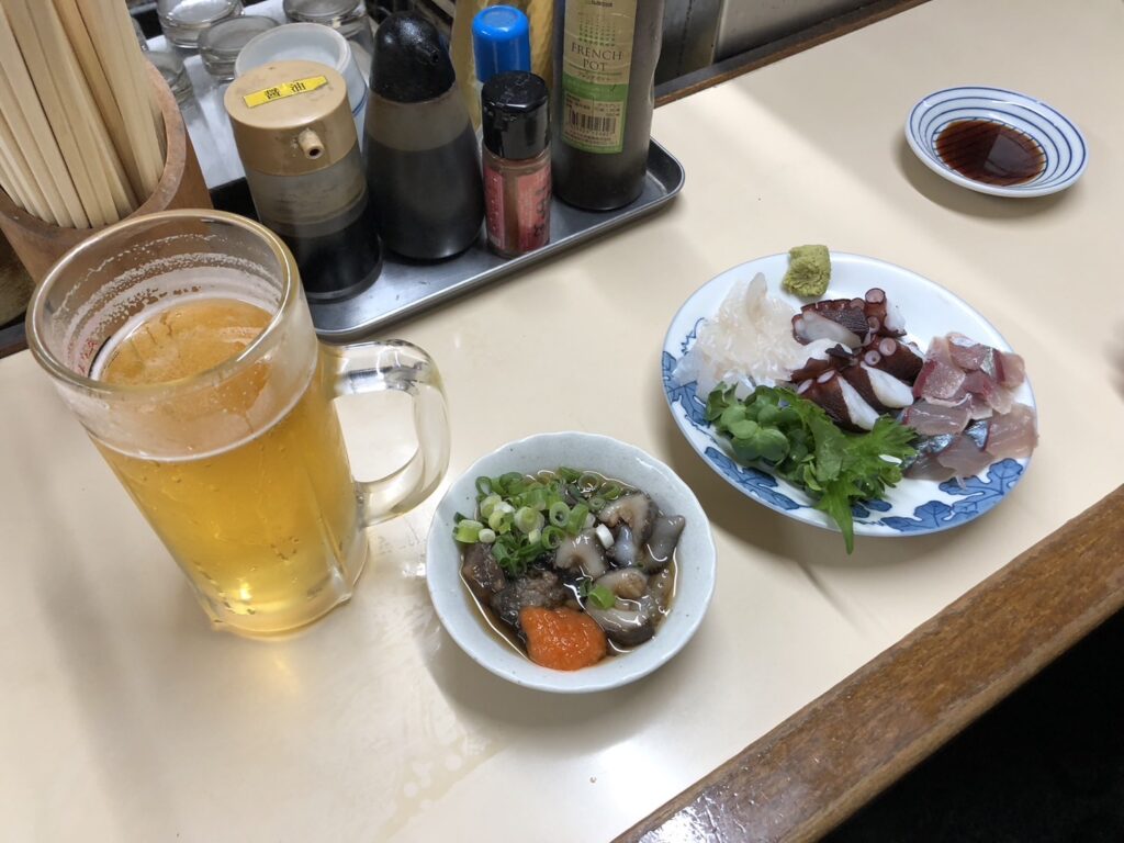 鹿間酒店は臨時休業で振られたが、それ以上のものを得た一日だった。曽根の昭和食堂「ことぶき食堂」の姫路おでんと焼き飯、明石「どんべえ」の鮮度抜群の刺身とナマコ酢、そして駅なかで〆た山陽そば——。