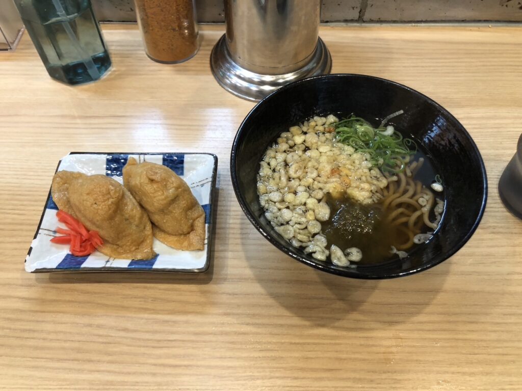 〆は駅なかの「山陽そば」で。そばと稲荷ずし