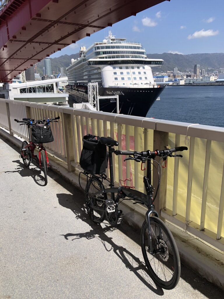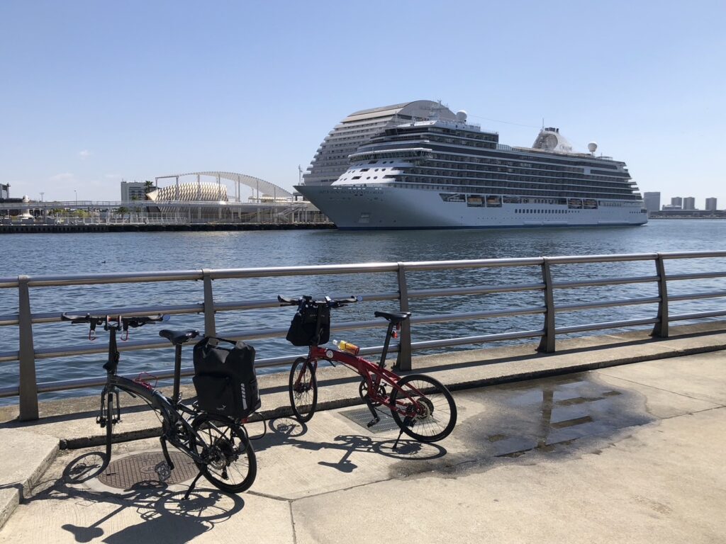 折りたたみ自転車のフレームと豪華客船のツーショットは、なかなかの絵になる構図だ。神戸ポートタワーと観覧車を背景に、2隻の船体が春の青空に映えている。