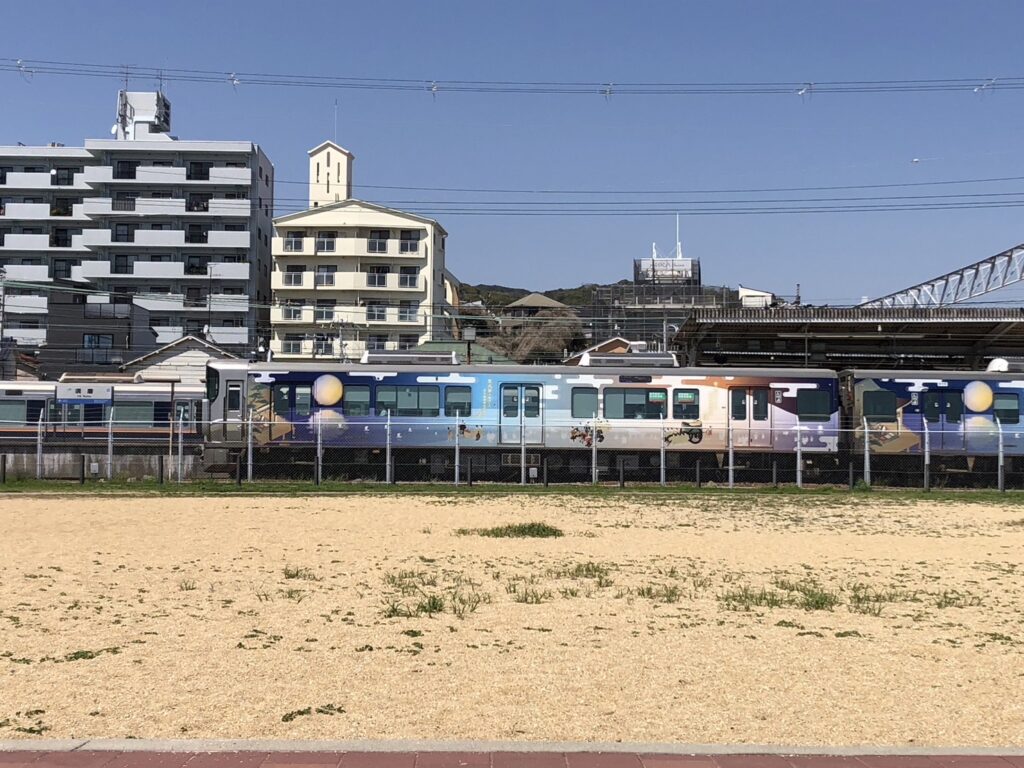 海岸を走るカラフルなJR神戸線の電車と、白い砂浜の組み合わせも、絵になる一コマだ。