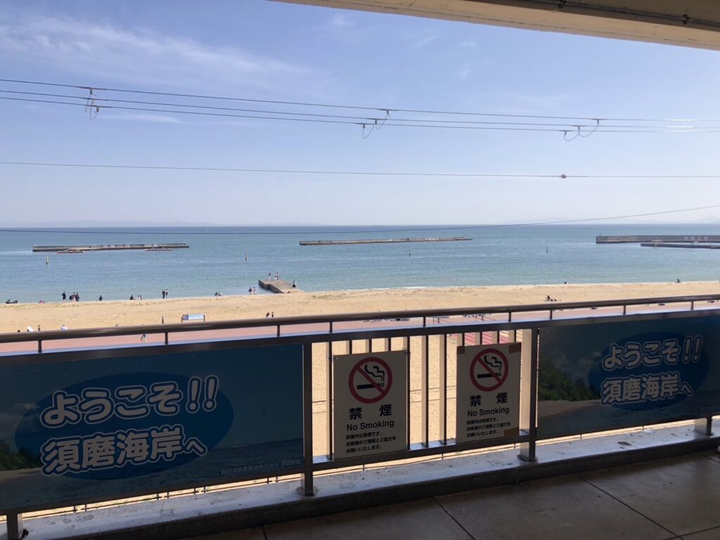須磨海岸の駅(JR須磨海浜公園駅)前には「ようこそ!!須磨海岸へ」の横断幕が掲げられており、駅のホームから直接砂浜を望める珍しいロケーションが旅情を高める。プラットホームと砂浜が隣り合う光景は、全国的にも珍しい部類に入るだろう。