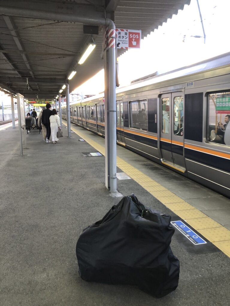 日も傾いてきたころ、帰路は輪行を選択。折りたたみ自転車を専用バッグに収納し、駅のホームへ。
