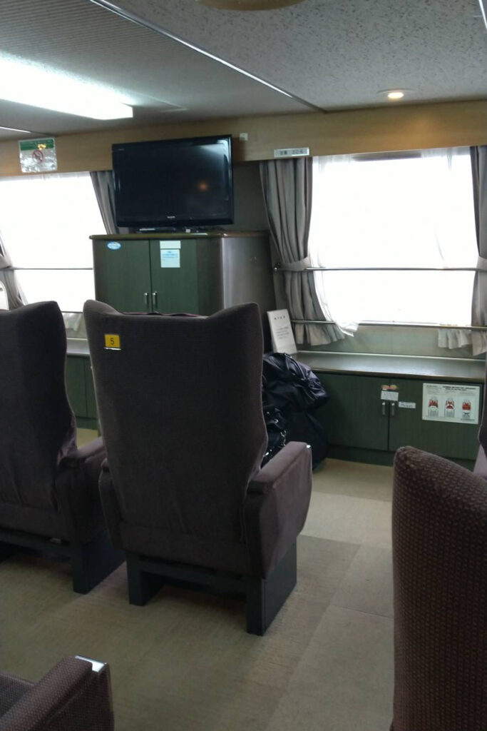 **フェリー客室にはゆったりとしたリクライニングシートが並んでおり、2時間があっという間に感じられる。**デッキに出ると紀伊水道の海風を受けながら、徳島の山並みが徐々に迫ってくる景色が楽しめた。電車輪行にはない「移動の旅感」が最高だ。