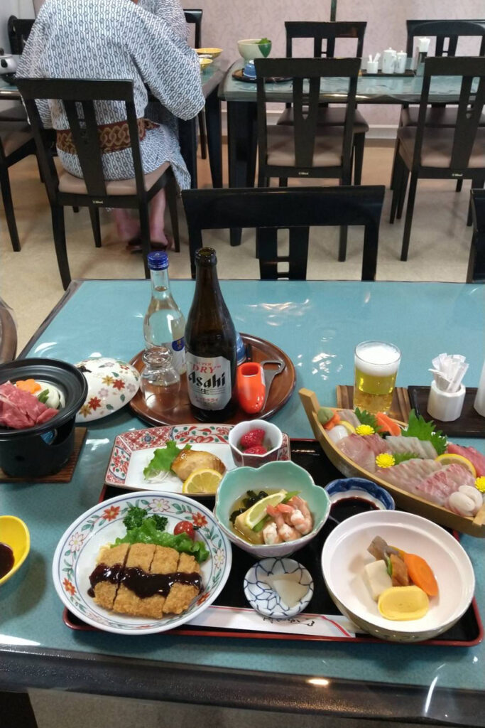 夕食は川を望む食堂で、新鮮な刺身の盛り合わせ、天ぷら、地元の惣菜など豪華な和定食が並んだ。