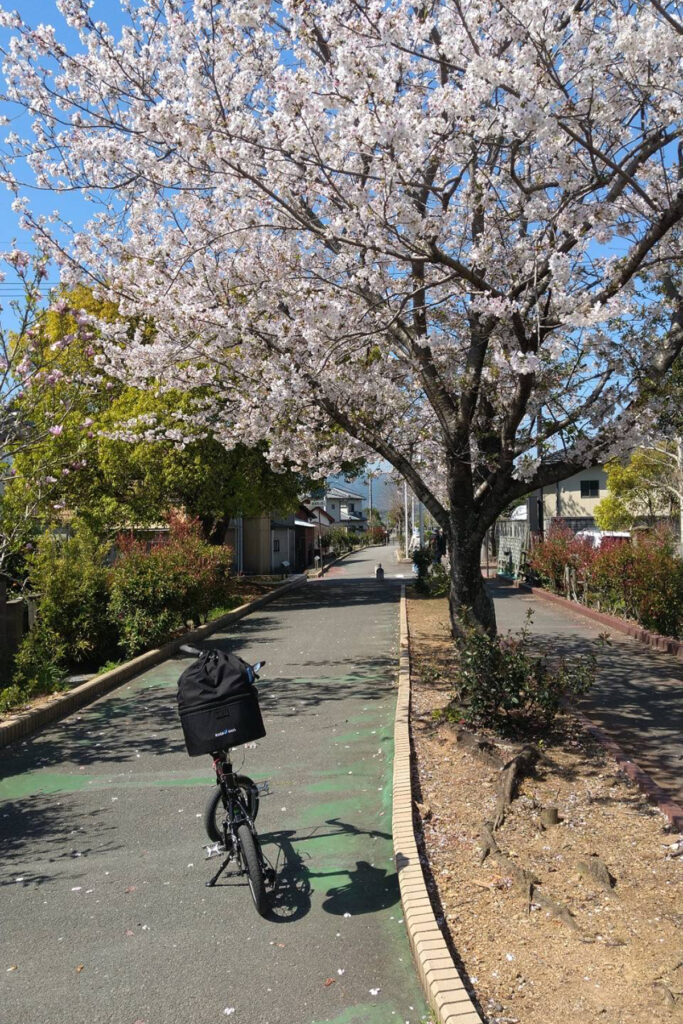 廃線跡の道沿いには桜の木もあり、4月初旬には満開の桜のトンネルの下をDAHON K3で走ることができた。青空と白ピンクの桜のコントラストが美しく、何度かミニベロを降りて写真を撮った。