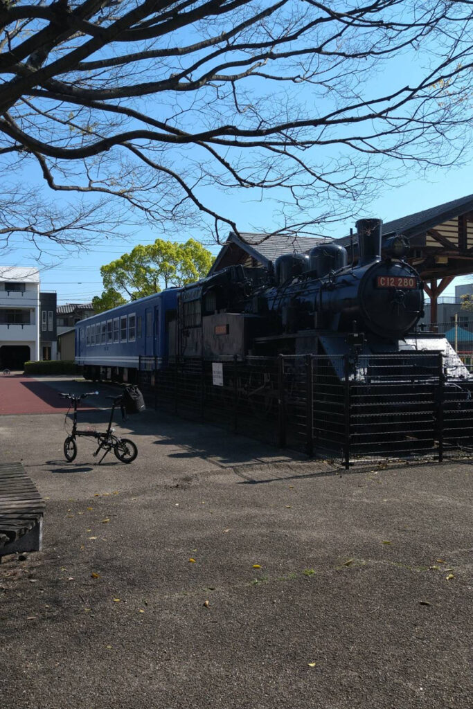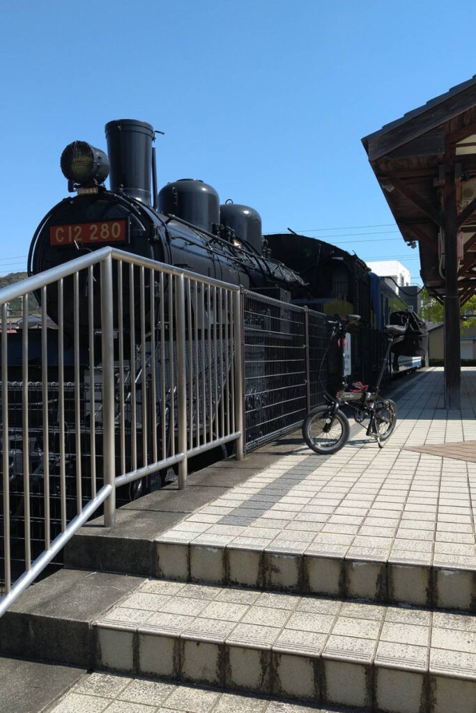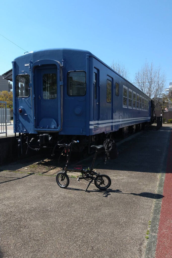 サイクリングロード沿いには、廃線時代の蒸気機関車(C12形)と青い客車が静態保存されているスポットがある。小さなDAHON K3と並べると時代のギャップが面白い1枚になった。歴史好きにも鉄道好きにもたまらないポイントだ。