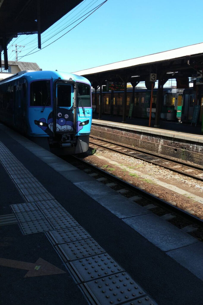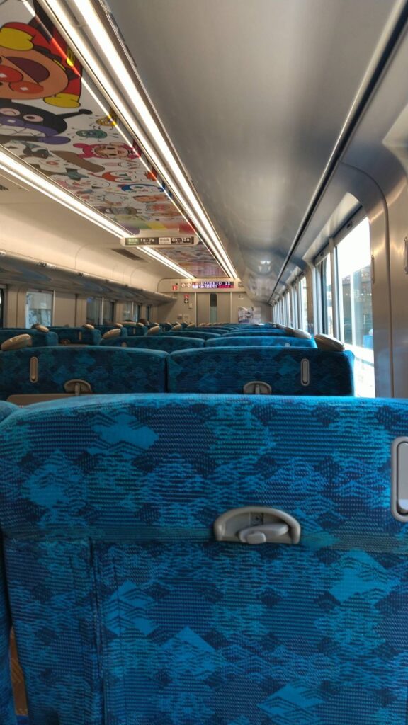 徳島駅ではなんと水色のアンパンマン列車が待っていた。天井にはアンパンマンのキャラクターが描かれており、大人でも思わず笑顔になる。